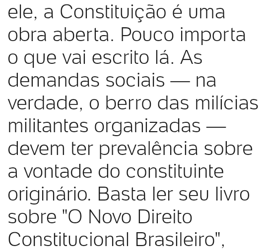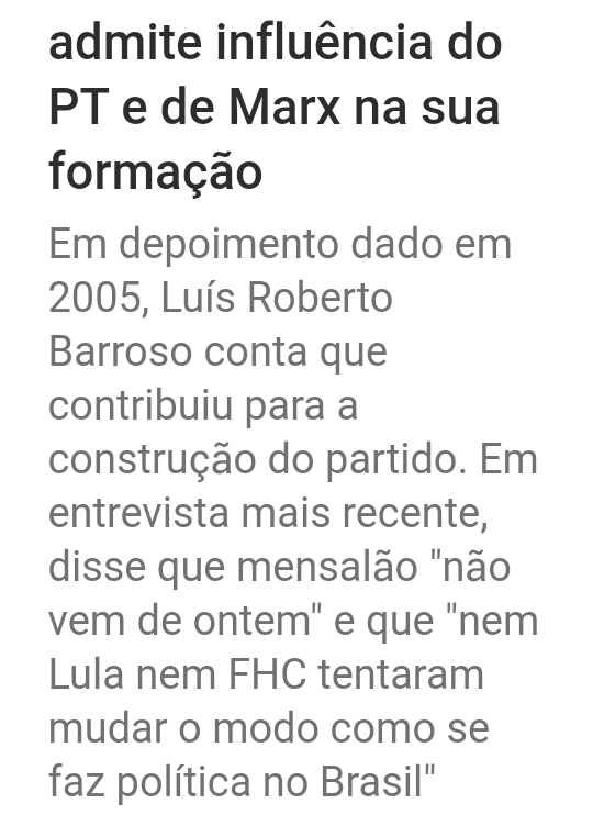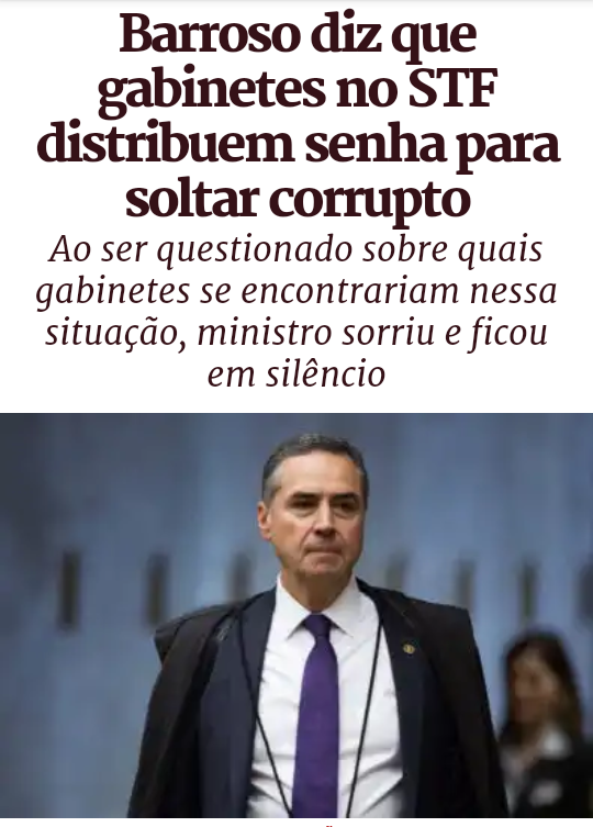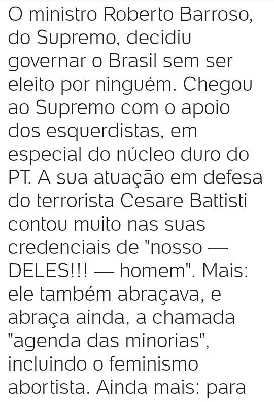 Ministro Barroso você é uma vergonha para os brasileiros. Sempre cheio de ódio e com pitadas de psicopatias nas atitudes e falas. Está ficando insuportável ter que assistir todos os dias as suas verborragias que tentam convencer em vão as pessoas, de que suas idéias já ultrapassadas, já implantadas em outros países