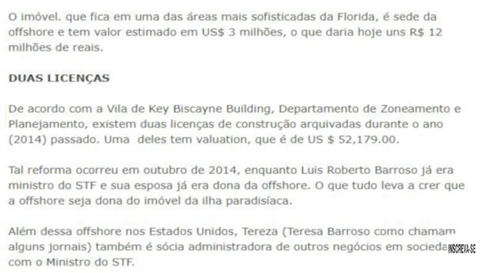 A senhora Tereza Cristina Van Brussel Barroso, esposa e sócia do ministro Luís Roberto Barroso, do STF, é apontada pela imprensa como possuidora de uma offshore nos Estados Unidos, situada na 350 Ocean Dr Unit 302N, Flórida.